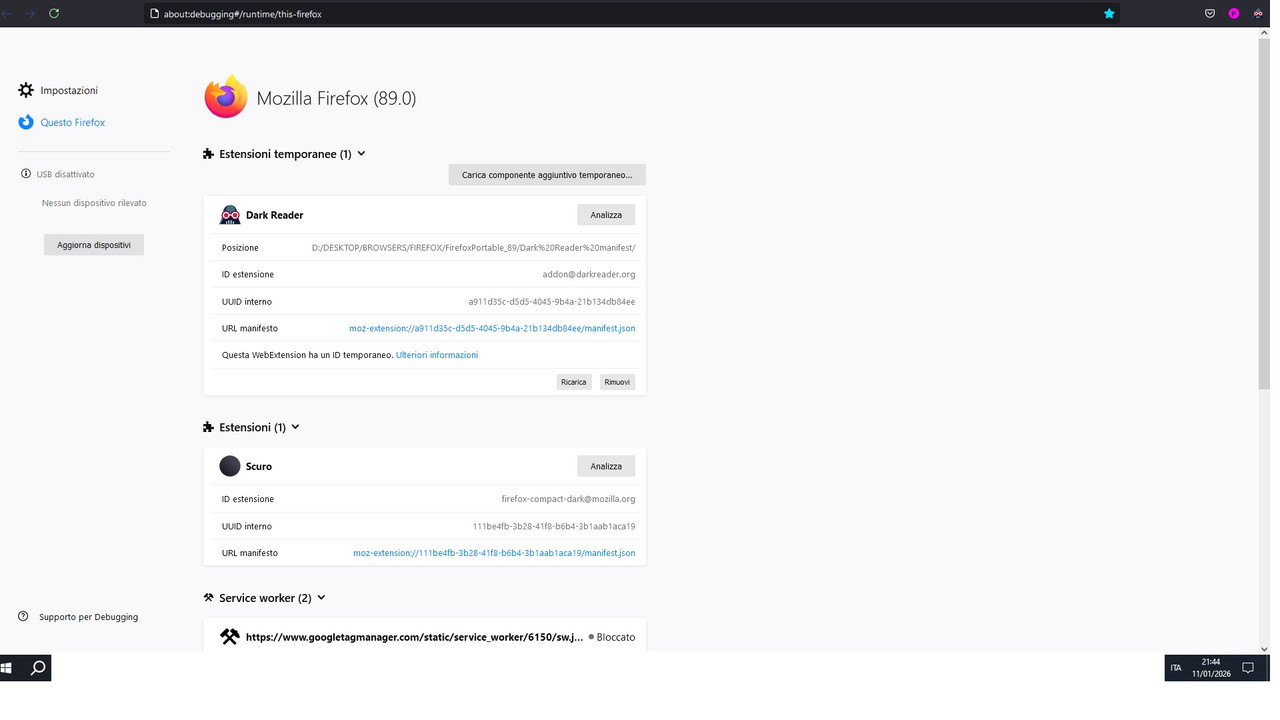 se vi può aiutare questo è lo screenshoot quando invece carico il manifest.jason della dark reader in modalità debug, cioè quella che va ripetuta ogni volta..: