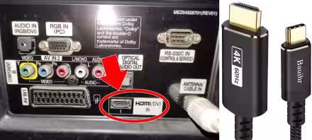Vogliamo quindi connetterci alla porta HDMI sullo schermo (foto di sinistra) tramite un cavetto dotato del medesimo connettore HDMI da una parte, e dello spinotto USB Type-C all'altro (foto di destra), da collegarsi al portatile