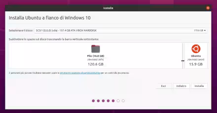 Arrivati al partizionamento, scegliete come distribuire lo spazio su disco fra Windows e Ubuntu trascinando il separatore verticale verso sinistra (più spazio a Ubuntu) o verso destra (più spazio a Windows). In tutti i casi, raccomando di allocare come minimo 64 GB ad ognuno