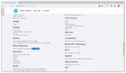 Il sito presentazionale (copia archiviata) evidenzia questa caratteristica, affiancandola a termini quali "Water Resistant", "Water repellant" e la precistazione Advanced nano-coating technology creates a water repellent barrier to help protect against moderate exposure to water, such as accidental spills, splashes, or light rain. Not designed to be submersed in water, or exposed to pressurised water or other liquids; not waterproof.