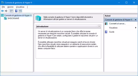 La schermata principale è una console che consente di creare, modificare e amministrare le macchine virtuali tramite Hyper-V. Per quanto riguarda l'uso in ambito home/piccolo ufficio, è sufficiente selezionare il primo ed unico elemento dall'albero di sinistra, quello che discende da Console di gestione di Hyper-V (mostrato come SHOCKWAVE nello screenshot seguente): rappresenta il PC locale.